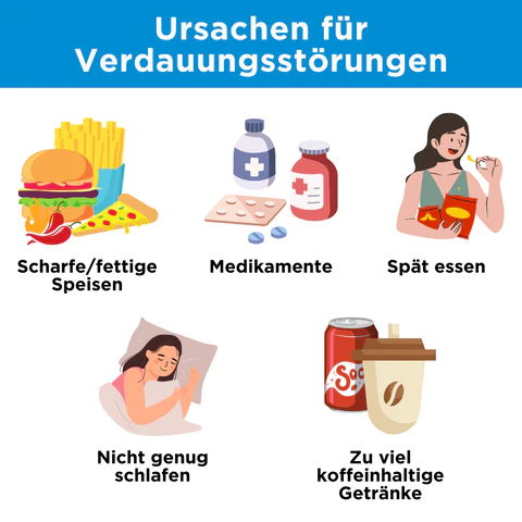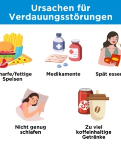 Während Verdauungsstörungen durch verschiedene Faktoren ausgelöst werden können, sind einige häufige Ursachen übermäßiges oder zu schnelles Essen, der Verzehr von fettigen oder scharfen Speisen, übermäßiger Alkohol- oder Koffeinkonsum, Rauchen, Stress, bestimmte Medikamente und Grunderkrankungen wie gastroösophageale Refluxkrankheit (GERD), Magengeschwüre oder Gastritis.