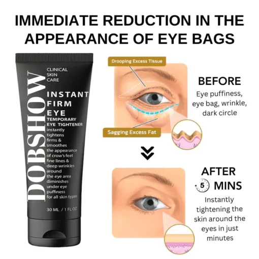 Immediate Eye Bag Reduction: Dobshow™ Clinical SkinCare Instant Eye Firmer provides immediate reduction in the appearance of eye bags. This is likely achieved through ingredients that provide a temporary tightening or firming effect on the skin around the eyes, producing a quick and noticeable improvement.