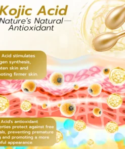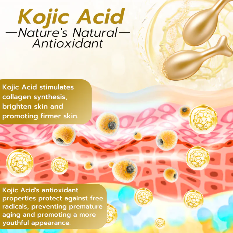 - Kojic Acid is renowned for its ability to inhibit melanin production, making it a powerful agent in skin whitening and hyperpigmentation reduction. By promoting collagen synthesis, Kojic Acid helps to brighten the skin and improve its overall texture, resulting in a firmer, more youthful appearance. It effectively targets dark spots and uneven skin tone, providing a balanced and radiant complexion.