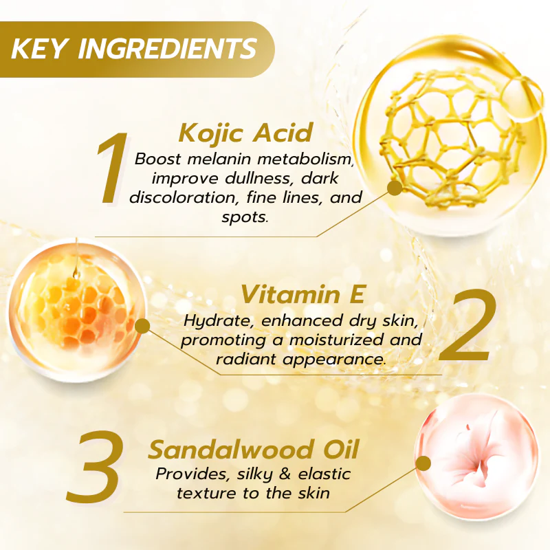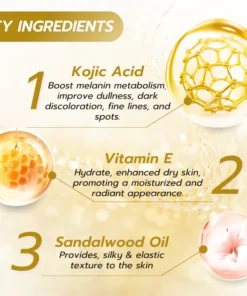 These Whitening Capsules take a multi-faceted approach to combat darkened skin tones by addressing the underlying causes of melanin overproduction. The potent ingredient Kojic Acid, regulates melanin synthesis, leading to a more balanced skin tone. Kojic Acid also stimulates collagen synthesis, brightens the skin, and promotes firmer, more youthful skin. Moreover, Kojic Acid’s ability to enhance the skin’s barrier function promotes overall skin health, ensuring a radiant complexion.