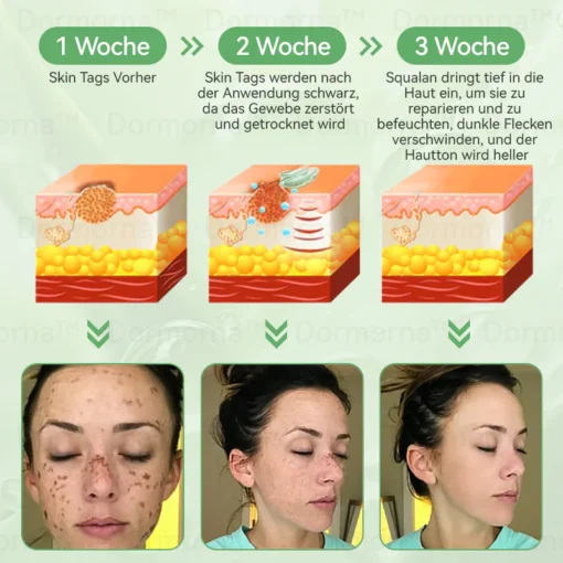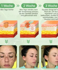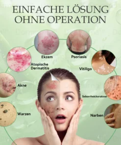 Die Kombination aus Aloe Vera, Centella Asiatica und Squalan unterstützt die Haut bei der natürlichen Abstoßung von erkranktem Gewebe und der Förderung der Hautzellenregeneration. Dies hilft, Warzen, Hautflecken und Akne effizient zu behandeln, ohne schädliche Nebenwirkungen.