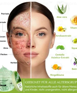 Die Dormorna™ Bio-Aloe Vera Total Repair Creme kombiniert die heilenden Eigenschaften von Aloe Vera, Vitamin E und weiteren natürlichen Zutaten, um Ihre Haut zu reparieren und zu pflegen. Mit einer speziell entwickelten Formel bietet diese Creme umfassende Unterstützung bei der Behandlung von Hautproblemen wie Warzen, Hautflecken, Akne und Psoriasis. Ideal für die tägliche Anwendung, um Ihre Haut wieder in ihren gesunden Zustand zu versetzen.
