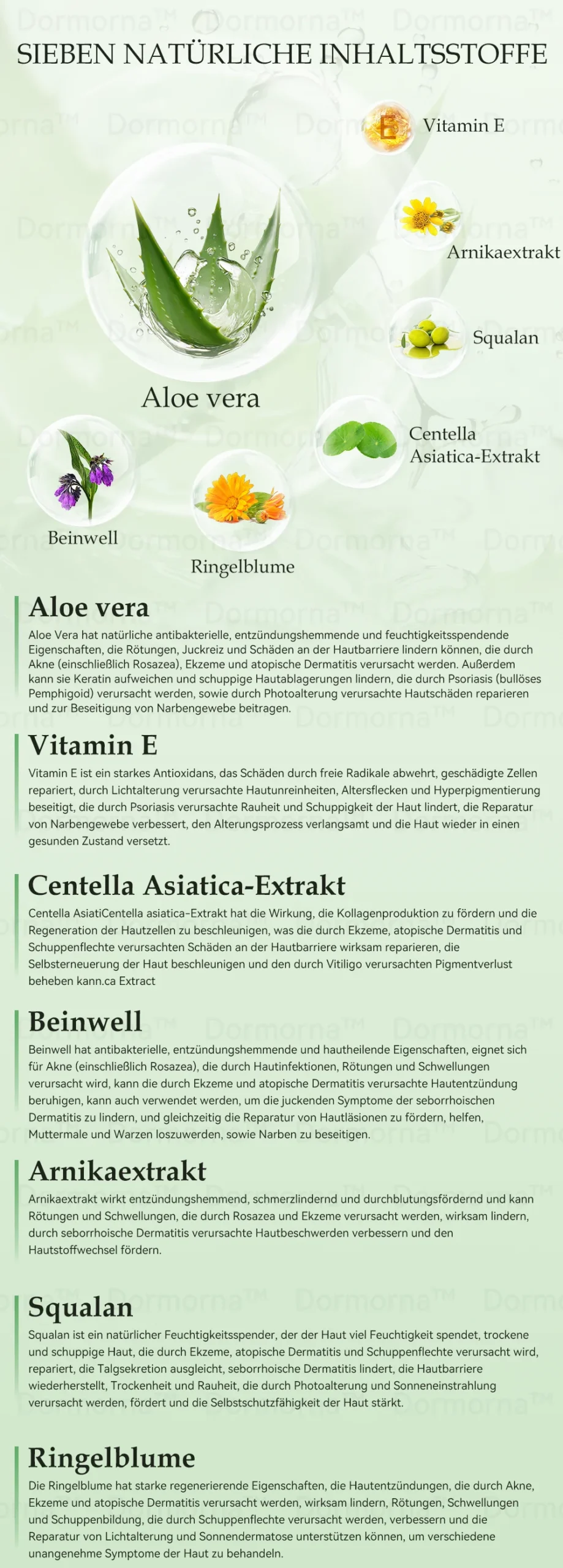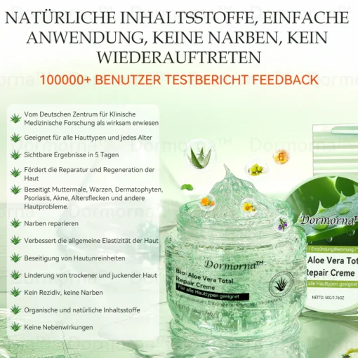 Mehr als 100.000 zufriedene Anwender haben bereits von der Wirksamkeit der Dormorna™ Bio-Aloe Vera Total Repair Creme profitiert. 99,5% der Nutzer berichteten von sichtbaren Verbesserungen innerhalb von 1–2 Wochen.