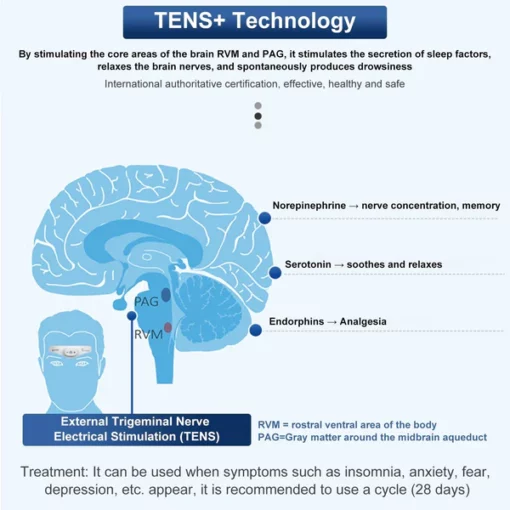 Dreamate™ performs neuromodulation by sending low-frequency pulses of specific frequency to the target area in the brain responsible for the release of endorphins, and reaches the high-level centers of the cerebral cortex through the nerves on the frame, which will regulate signals from various biological and physical channels, activate the endorphin system of the human body, and help the human body restore sleep function.
