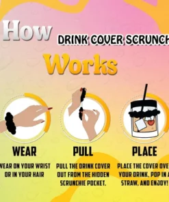 How it Works – Simply wear on the wrist or in your hair. When needed, pull the drink cover out of the hidden, sanitary pocket inside of the scrunchie.