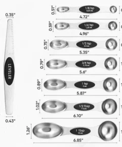 The Dual-Sided Measuring Spoons set offers 7 essential sizes: 1/8 tsp, 1/4 tsp, 1/2 tsp, 3/4 tsp, 1 tsp, 1/2 Tbsp, and 1 Tbsp, plus a Leveler to ensure precise measurements. Perfect for both daily cooking and baking needs, these spoons make your kitchen tasks easier.