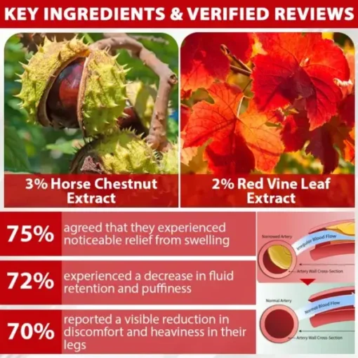 The active compound Aescin helps improve venous tone and reduces capillary permeability, preventing fluid leakage and minimizing swelling. Flavonoids provide antioxidant and anti-inflammatory effects that protect blood vessels, improve elasticity, and support better lymphatic drainage. This powerful combination works together to reduce swelling and discomfort, promoting long-term vascular health and offering effective relief from edema.