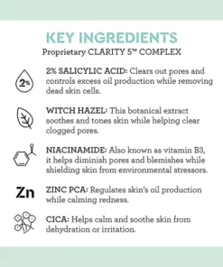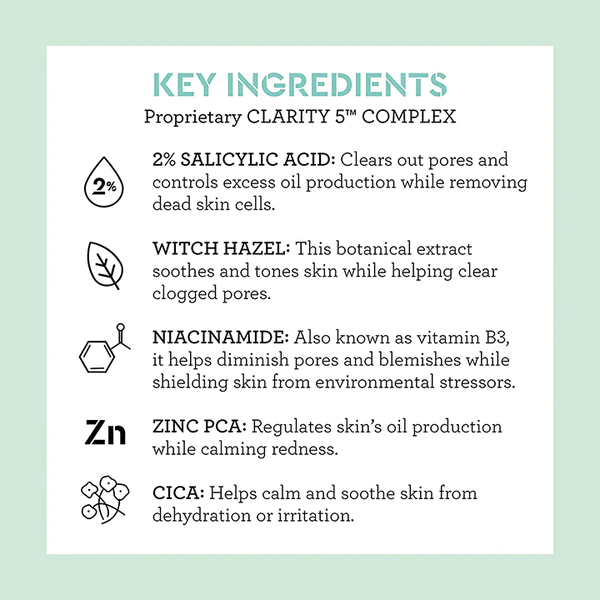 - Ingredients: Purified Water, 2% Salicylic Acid (Beta Hydroxy Acid), Witch Hazel Extract, Niacinamide, Zinc PCA, CICA, Mangosteen Extract, Aloe Vera Extract, Grain Ethanol, L-Arginine, L-Lysine, Colloidal Silver, Lavandula latifolia, Camphor, Melaleuca Alternifolia (Tea Tree) Oil, Mentha Piperita (Peppermint) Oil, Limnanthes Alba (Meadowfoam) Oil.