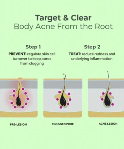 Its sensitive skin-friendly, anti-acne formula is rich in antibacterial and soothing plant extracts that address back and shoulder acne, blackheads, and whiteheads. It contains 2% salicylic acid (Beta Hydroxy Acid) which goes deep into your pores to dissolve trapped oil and impurities, shed dead cells from the top layer, and clear blockages that are causing the breakouts.