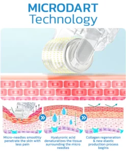 Microdart technology can help your skin in several ways. When micro-needles penetrate the skin, they create tiny channels or microchannels that can allow skincare products or active ingredients to penetrate deeper into the skin. This enhances the effectiveness of the products, making them more efficient in addressing skin concerns. It can also stimulate collagen production, which can help to improve the skin’s elasticity, reduce fine lines and wrinkles, and improve overall skin texture.