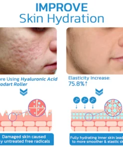 The EELHOE™ PockmarksHeal Hyaluronic Acid Microdart Roller is a skincare tool that uses micro-needles to penetrate the skin and deliver hyaluronic acid to help smooth and plump the skin. The micro-needles are designed to be small and gentle, and the hyaluronic acid helps to hydrate and moisturize the skin, which can treat pockmarks or other skin imperfections and improve the appearance of fine lines and wrinkles.