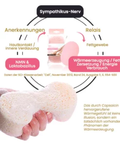 Der Schwamm enthält 2 natürliche Inhaltsstoffe, die vom Körper über die Haut aufgenommen werden und die das sympathische Nervensystem aktivieren. Dies wiederum trägt dazu bei, den Stoffwechsel des Körpers zu erhöhen, was zu einer Steigerung der Geschwindigkeit führt, mit der der Körper Kalorien und Fett verbrennt.