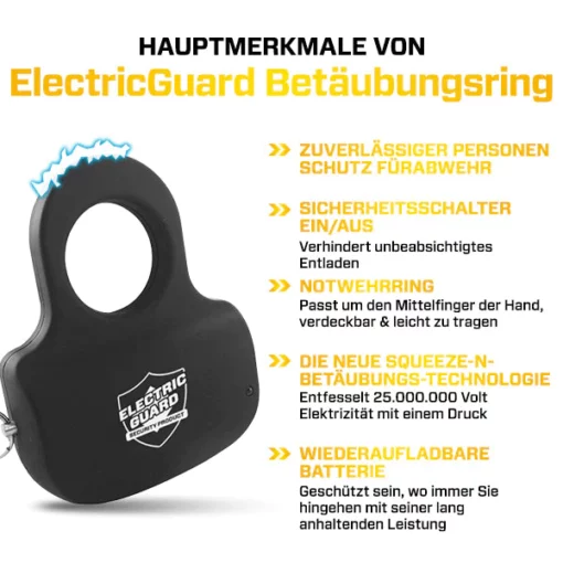Dieser Ring hat eine beeindruckendere Schlagkraft als die meisten größeren Betäubungsgeräte. Es setzt 25.000.000 Volt Strom frei und kann dank der innovativen Squeeze-N-Stun- Technologie einfach durch einfaches Drücken aktiviert werden.