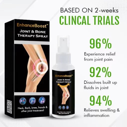 EnhanceBoost™ Joint & Bone Therapy Spray is a revolutionary product designed to support healthy bones and joints. It is a blend of natural ingredients that have been scientifically proven to promote joint health, reduce inflammation, and improve overall bone density!