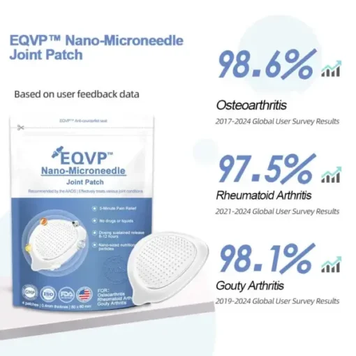 The EQVP™ Nano-Microneedle Joint Patch offers a long-lasting, slow release of the medication, ensuring a stable effect over 24 hours without causing any discomfort. With the same dosage and price, it can maintain up to 20 times longer-lasting effects (similar to the difference between an IV drip and a single injection).