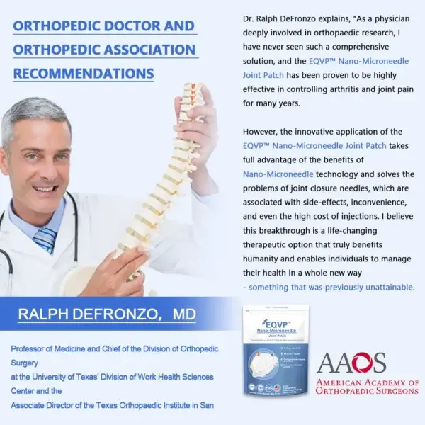 “Two years ago, I was diagnosed with cervical spondylosis and cysts. Since then, I have been suffering from limited mobility and neck pain. I tried various products and treatments, but nothing seemed to help. Then, I heard about this amazing joint patch. I decided to give it a try, and after one week of use, I noticed that the pain was reduced and the swelling in my neck was significantly reduced. After one month of use, my neck has regained normal function and I can participate in daily activities without the pain of cervical spondylosis and cysts. I am very grateful to the EQVP™ Nano-microneedle joint patch, which has changed my life and given me back my freedom and comfort!” – Isabelle Simpson