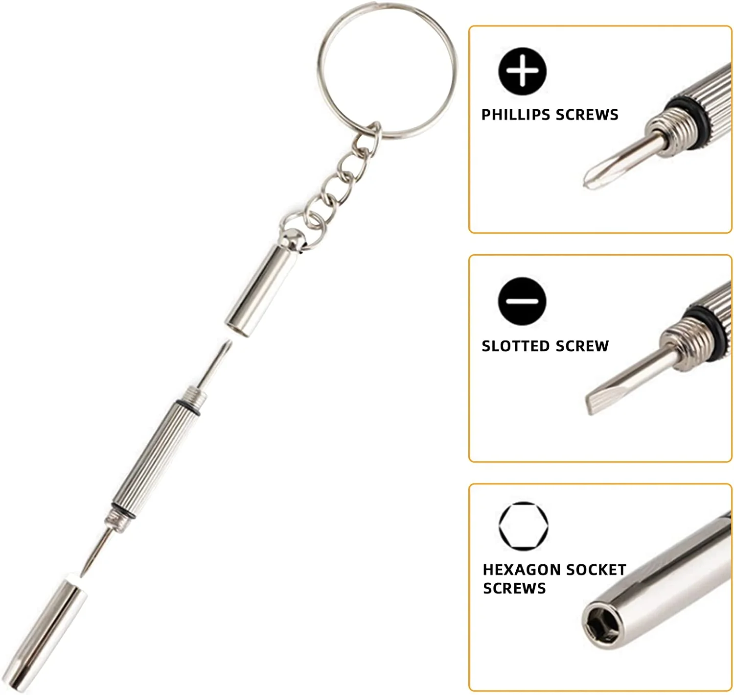 Comparing with other original eyeglass screwdriver, our sunglass repair kit has 4 in 1 special design, includes the flat-head screwdriver, phillips-head screwdriver, torx screwdriver and hexagonal screwdriver.The surface of the screwdriver tool set is adapted by durable stainless steel material, easy and pretty comfortable to grip in hand and convenient to use for different kinds of repairs.