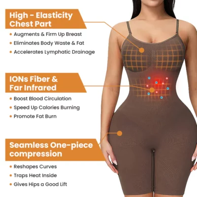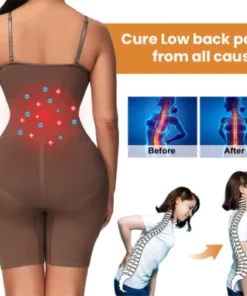 This bodysuit is meticulously crafted to promote better posture by using IONs to adjusting metabolism, pushing arm and sub-mammary fat back into your breasts, helping your muscles return to their proper position, potentially through compression and support. Additionally, if it incorporates Far Infrared technology, it might contribute to a thermogenic effect, promoting increased heat and potentially assisting in the burning of fats around the back fat, and simultaneously boosting blood circulation and eliminate excess skin on the back of the arms