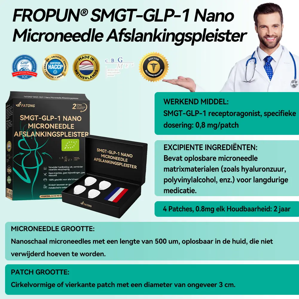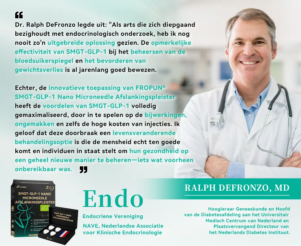 “De FATONG™ SMGT-GLP-1 Afslankingspleister is een groot succes voor mijn patiënten die worstelen met gewichts- en bloedsuikerproblemen. Voor optimale resultaten raad ik aan om 4 doosjes te kopen – studies tonen aan dat hoe meer je het gebruikt, hoe effectiever het wordt.”