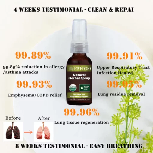 FemiPure™ FRESH BreatheWell Natural Herbal Spray for Lung and Respiratory Support gives you powerful lung support. Our formula is designed to cleanse your lungs and airways, channeling old mucus and lung buildup out. Unclog your airways and strengthen your breathing in 8 weeks, helping you breathe easy again. Relieve the symptoms and sequelae of lung cough caused by the COVID-19 virus.