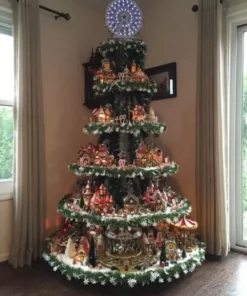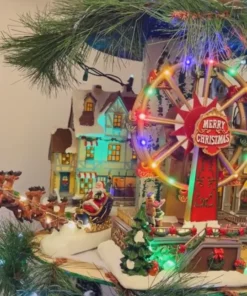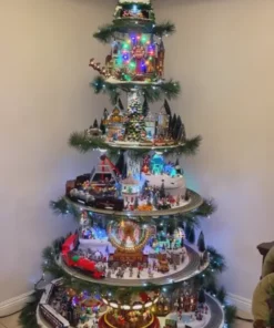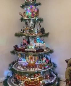 A Christmas Tree Village combo instead of a regular tree complete with a Train, a Ferris Wheel, Illuminated houses and Santa Claus climbing on a ladder