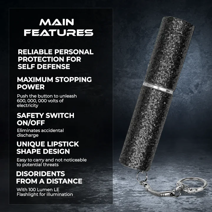 This lipstick stun gun is a product that combines the appearance of a cosmetic lipstick with the functionality of a stun gun and a flashlight. It is designed to provide women with a discreet and effective self-defense tool that can be easily carried and used in case of an emergency.