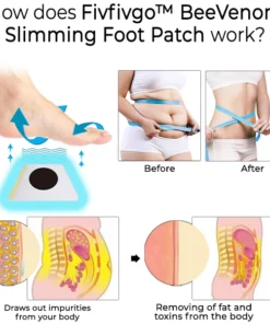 Das Fivfivgo™ BeeVenom Slimming Foot Patch nutzt die Prinzipien der Reflexzonenmassage und der natürlichen Entgiftung. Beim Auftragen auf die Füße dringen das Bienengift und weitere pflanzliche Inhaltsstoffe durch die Haut und zielen auf die Reflexpunkte ab, die mit verschiedenen Organen und Systemen im Körper verbunden sind. Dies stimuliert die Durchblutung, steigert die Stoffwechselaktivität und fördert die Beseitigung von Giftstoffen und überschüssigem Fett.