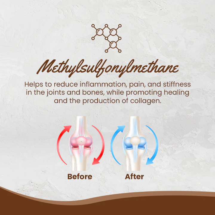 Methylsulfonylmethan (MSM/DMSO2) ist eine natürliche organische Verbindung, die Entzündungen, Schmerzen und Steifheit in Gelenken und Knochen lindert und gleichzeitig die Heilung und die Produktion von Kollagen fördert. MSM/DMSO2 trägt auch zur Verbesserung der Durchblutung bei, sodass mehr Nährstoffe die Gelenke und Knochen erreichen.