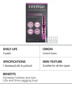 Fivfivgo™ Breast Enhancement Lift Ampoules Oil has the potential to increase the capacity of existing cells that can store lipids while also speeding up the generation of new cells that can do,so cells that can store more lipids encourage the growth of tissues like the breast.