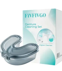 - Handig kofferontwerp: De Fivfivgo™-set beschikt over een compacte en draagbare koffer die dient als handige opslag- en reinigingsoplossing. Voeg eenvoudigweg de reinigingsoplossing toe, plaats uw kunstgebit erin en laat Fivfivgo™ de rest doen.