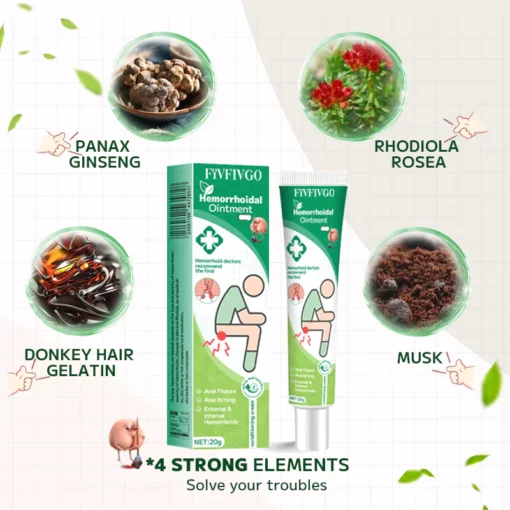 Fivfivgo™ Hämorrhoidalsalbe kombiniert die Kraft der traditionellen Kräutermedizin – Eselshautgelatine und Rhodiola rosea. Diese Salben sind so konzipiert, dass sie durch die Darmwand absorbiert werden, wo Kollagen seine Wirkung entfaltet, indem es verstopfte und gebrochene Blutgefäße repariert, die Erweiterung reduziert und das Darmschleimhautgewebe schützt, was letztendlich die Heilung von Hämorrhoiden fördert. Darüber hinaus versorgen sie den Darm mit Nährstoffen und Feuchtigkeit und helfen so bei der Behandlung von Verstopfung und der Vorbeugung anderer Analerkrankungen.