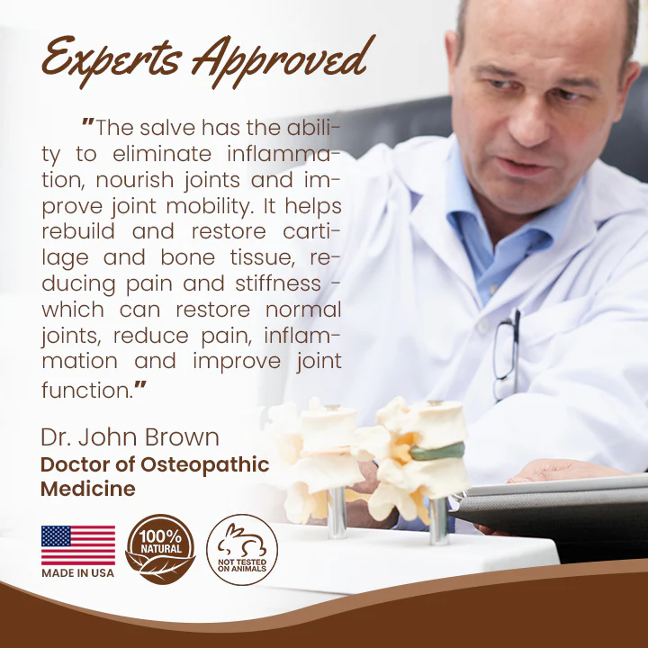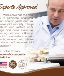 „Ich empfehle die Fivfivgo™ JointCure Bio-Kräutersalbe allen, die an Gelenkerkrankungen wie Osteoarthritis, rheumatoider Arthritis und anderen Gelenkverletzungen leiden. Die Salbe kann Entzündungen lindern, Gelenke nähren und die Gelenkbeweglichkeit verbessern. Sie hilft beim Wiederaufbau und der Wiederherstellung von Knorpel- und Knochengewebe und lindert Schmerzen und Steifheit – was normale Gelenke wiederherstellen, Schmerzen und Entzündungen lindern und die Gelenkfunktion verbessern kann.“ – Dr. John Brown, Doktor der Osteopathie