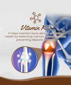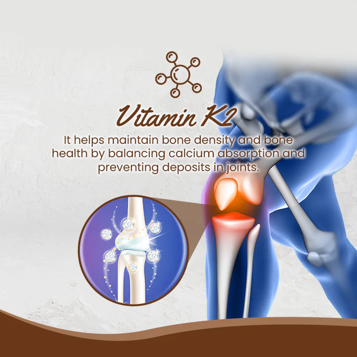 Vitamin K2 spielt eine entscheidende Rolle im Kalziumstoffwechsel, indem es Kalzium aus dem Blut in die Knochen transportiert. Es trägt zur Erhaltung der Knochendichte und -gesundheit bei, indem es die Kalziumaufnahme ausgleicht und Ablagerungen in den Gelenken verhindert.