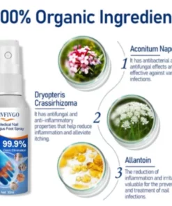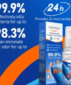 Fivfivgo™ Medizinisches Nagelpilz-Fußspray ist eine wissenschaftlich erprobte, schnell wirkende Lösung für bakterielle Fußerkrankungen. Es hat eine 99%ige Wirksamkeitsbewertung und wurde für eine Vielzahl von Fußproblemen formuliert, um eine optimale Fußgesundheit zu gewährleisten. Es tötet Bakterien, Hefe und Schimmel bei Kontakt ab, verschafft sofortige Linderung und beseitigt 99,99 % der Bakterien in weniger als 1 Minute. Das Spray hilft, das pH-Gleichgewicht der Haut zu erhalten, und hält 7 Tage lang. Das Spray enthält ausschließlich natürliche Inhaltsstoffe, die sicher in der Anwendung sind und die Heilung von trockenen, brüchigen Nägeln und geschädigter Haut fördern. Wirksame Behandlung von Pilzinfektionen, grauen Nägeln, Nagelinfektionen, Fußpilz und schlechtem Geruch.