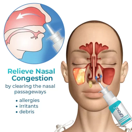 Fivfivgo™ Nasal Mucus Cleansing Spray works to relieve nasal congestion by clearing the nasal passageways of any allergies, irritants, or debris that may be there. By washing these particles out of the nasal passages with the spray’s tiny mist, it can help to lessen swelling and congestion. Additionally, it aids in moisturizing the nasal passages to lessen dryness and irritability.