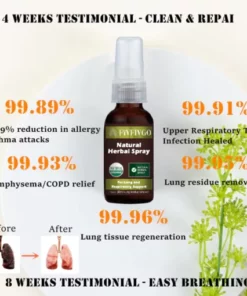 Are you having trouble breathing due to allergies, asthma, smoking, COPD, pneumonia, bronchitis, or a weakened respiratory system? Fivfivgo™ Natural Herbal Spray for Lung and Respiratory Support gives you powerful lung support. Our formula is designed to cleanse your lungs and airways, channeling old mucus and lung buildup out. Unclog your airways and strengthen your breathing in 8 weeks, helping you breathe easy again. Relieve the symptoms and sequelae of lung cough caused by the COVID-19 virus.