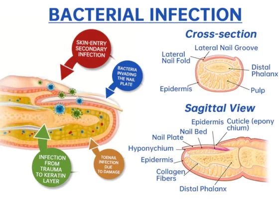 Bei der Infrarot-Kaltlasertherapie sendet ein Infrarotlaser Infrarotlicht aus, das auf schmerzende oder verletzte Bereiche gerichtet wird. Dieses Infrarotlicht ist in der Lage, tief in die Haut einzudringen und das innere Gewebe zu erreichen. Diese Infrarot-Wellenlängen lösen im Gewebe biophysikalische Effekte aus, die den Zellstoffwechsel ankurbeln, die Energieproduktion in den Zellen für das Nagelwachstum beschleunigen, die Durchblutung verbessern, Entzündungen und Infektionen im Bereich der Paronychie vollständig beseitigen und die Gewebereparatur und den Heilungsprozess insgesamt verstärken.