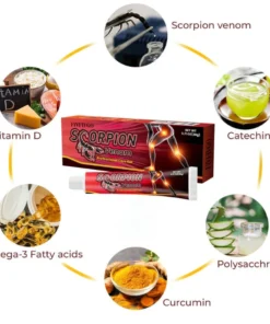 - Skorpiongift enthält unter anderem auch Enzyme, Aminosäuren, Zucker, Lipide und Vitamine. Diese Inhaltsstoffe haben auch eine gewisse Wirkung auf die Reparatur des Gelenkgewebes, die Verbesserung der Gelenkelastizität und die Beweglichkeit.