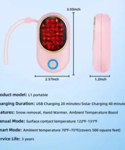 Da die Fivfivgo™ Solare elektromagnetische Resonanz Schneefeger-Heizung tragbar ist, können wir sie in unsere Taschen stecken und im Winter mitnehmen. Sie hält Ihre Körpertemperatur jederzeit aufrecht, so dass Sie nicht in dicke Kleidung schlüpfen müssen, wenn Ihnen nicht kalt ist. Wenn Sie den Knopf drücken, schaltet er in den manuellen Modus, und die Kontakttemperatur an der Oberfläche kann 122℉-131℉ erreichen, um den Körper gezielt zu erwärmen. Der Vorteil gegenüber Handwärmern ist, dass die Wärme nicht nur lokal auf der Oberseite des Gehäuses erzeugt wird. Der elektromagnetische Resonanzwärmeeffekt im manuellen Modus kann den gesamten menschlichen Körperbereich abdecken, so dass sich der ganze Körper angenehm warm anfühlt. Der Stromverbrauch ist so gering, dass das Gerät einen Monat lang mit einer einzigen Ladung betrieben werden kann.
