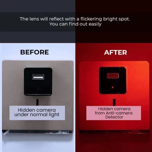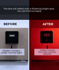 Anti-Spionage-Kamera-Finder und Bug-Detektoren sind Geräte, die versteckte Kameras, Bugs und andere Überwachungsgeräte erkennen können. Sie funktionieren, indem sie einen Ring aus roten LEDs zum Leuchten bringen und ein Objektiv, durch das Sie schauen, die Kameraobjektive als helle rote Punkte erscheinen lassen. Das vom Objektiv reflektierte Licht wird vom Gerät erfasst und kann dann zur Lokalisierung der versteckten Kamera verwendet werden.
