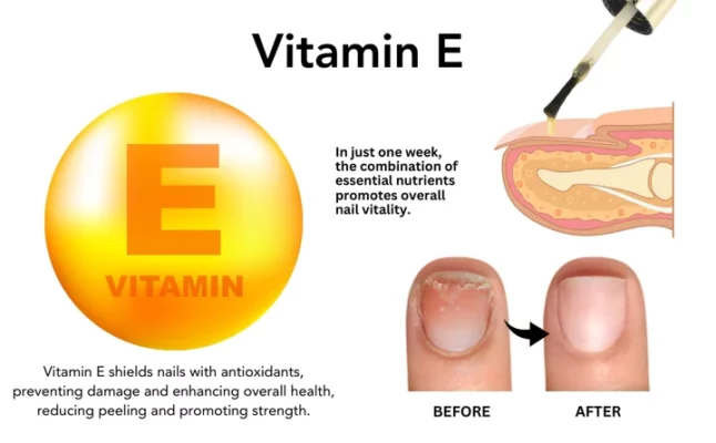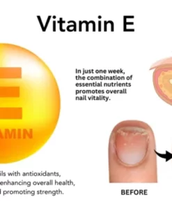 Vitamin E: ist bekannt für seine antioxidativen Eigenschaften, die dazu beitragen, die Nägel vor oxidativem Stress und Schäden zu schützen. Indem es Zellschäden verhindert, unterstützt es die allgemeine Nagelgesundheit, verringert die Wahrscheinlichkeit des Schälens und fördert stärkere, widerstandsfähige Nägel.