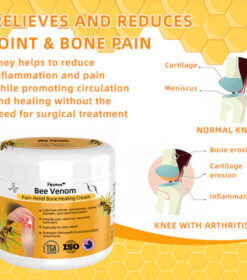 When applied to the skin, Bee Venom interacts with receptors involved in pain and inflammation, modulating inflammatory pathways and potentially reducing the release of pro-inflammatory molecules that cause joint and bone swelling.