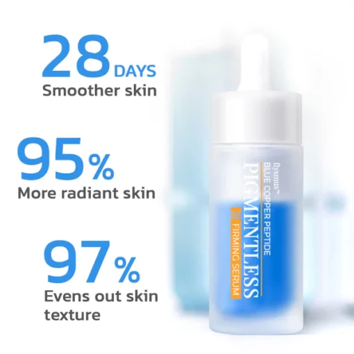 Das flysmus Blue Copper Peptide Pigmentless Firming Serum ist ein spezielles Serum, das für einen sofortigen pigmentfreien Teint sorgt. Es zielt auf drei häufige Hautprobleme ab, die zur Hautalterung beitragen – Falten, ungleichmäßiger Hautton, Pigmentierung und Verlust der Festigkeit – und ist somit ein wichtiger Bestandteil Ihrer täglichen Routine, um jugendlich aussehende Haut zu erhalten.