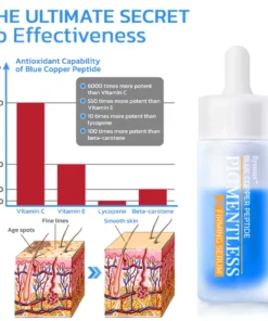Kupferpeptid ist ein starkes Antioxidans und der Schlüssel zur Bekämpfung von Hautalterung und Falten. Dieser außergewöhnliche Inhaltsstoff stellt andere Hautpflegekomponenten in den Schatten: Er ist 6000-mal wirksamer als Vitamin C, 550-mal wirksamer als Vitamin E, 10-mal wirksamer als Lycopin und 100-mal wirksamer als Beta-Carotin.