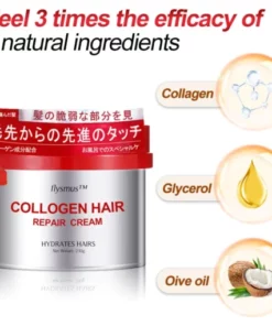 flysmus™ Collagen Hair Repair Cream enriched with nourishing ingredients: collagen, glycerin and coconut oil. These ingredients penetrate into the hair to provide deep nourishment and repair damaged cuticles and scales. They help to strengthen and elasticize the hair, reducing the problem of easy breakage and split ends. At the same time, they repair damaged areas and make the hair stronger.
