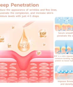 EGF reduce the appearance of fine lines and wrinkles, improve overall tone and texture, and supports rejuvenation and revitalization. EGF is a naturally occurring protein that plays a pivotal role in the regeneration and rejuvenation of skin cells. By stimulating cellular activity, EGF promotes the production of collagen and elastin, essential components for maintaining skin’s elasticity and firmness.