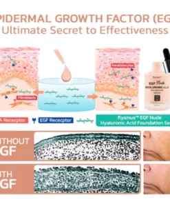The flysmus™ EGF Nude Hyaluronic Acid Foundation Serum works by employing a multi-dimensional approach to address diverse skin concerns. It harnesses the power of EGF to stimulate the skin’s natural regeneration process, boosting collagen and elastin production for reduced fine lines and improved skin elasticity.