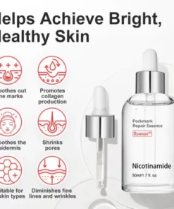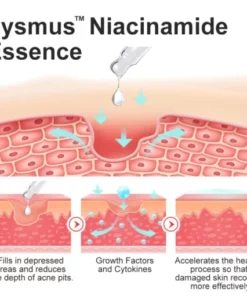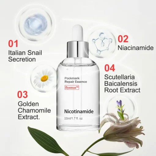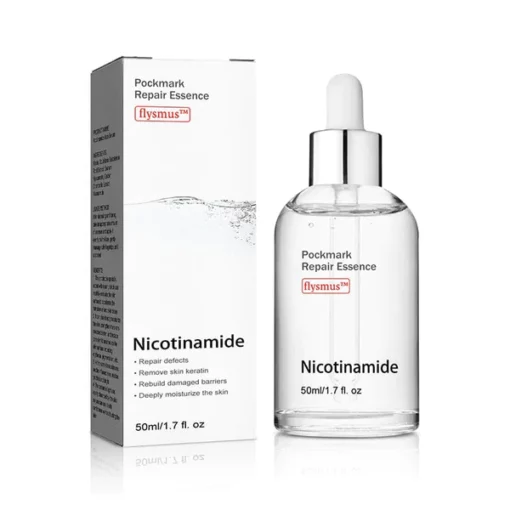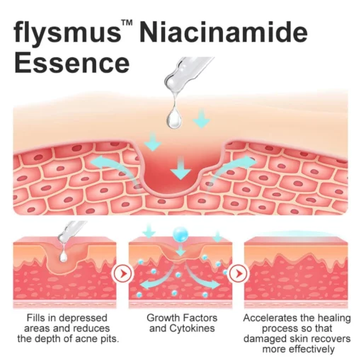 The flysmus™ Niacinamide Pockmark Repair Essence promotes skin cell regeneration, collagen synthesis, and overall skin rejuvenation, leading to a more refined, even-toned complexion with visibly reduced pockmarks and improved skin texture.