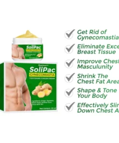 With its specific formulation, the flysmus™ SoliPac Gynecomastia Tightening Herbal Cream aims to diminish the appearance of gynecomastia, assuage chest discomfort, reduce swelling, and soothe tenderness.