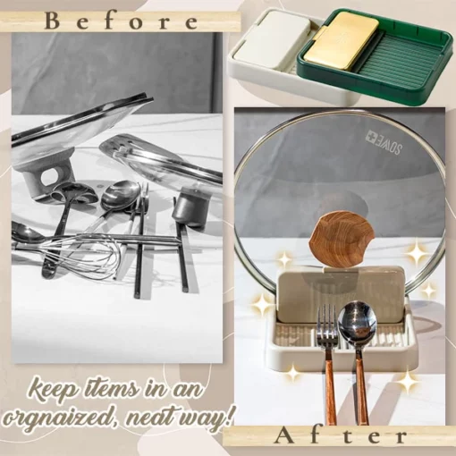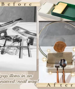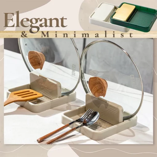A flat, tray-style holder designed with fine grooves and support which enables you to successfully rest your pot lid and spatula anytime. It efficiently collects all water drips, sauces, and oils from the utensils and keeps them away from your counters or table tops. No worries as it is deep enough to gather all liquids from your cooking session without spilling out. Saving you from the tiring back-and-forth mess wiping and also maintaining your kitchen neat and organized. Moreover, this rack allows you to keep necessary tools always at an easy, accessible place.